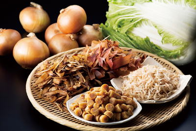<魚介しぼり醤油スープ>豚骨(国産)、鶏ガラ(国産)、醤油、白菜、豚肉、豚脂、玉ねぎ、かつお節、宗田かつお節、さば節、えび、ほたて/調味料(アミノ酸等)